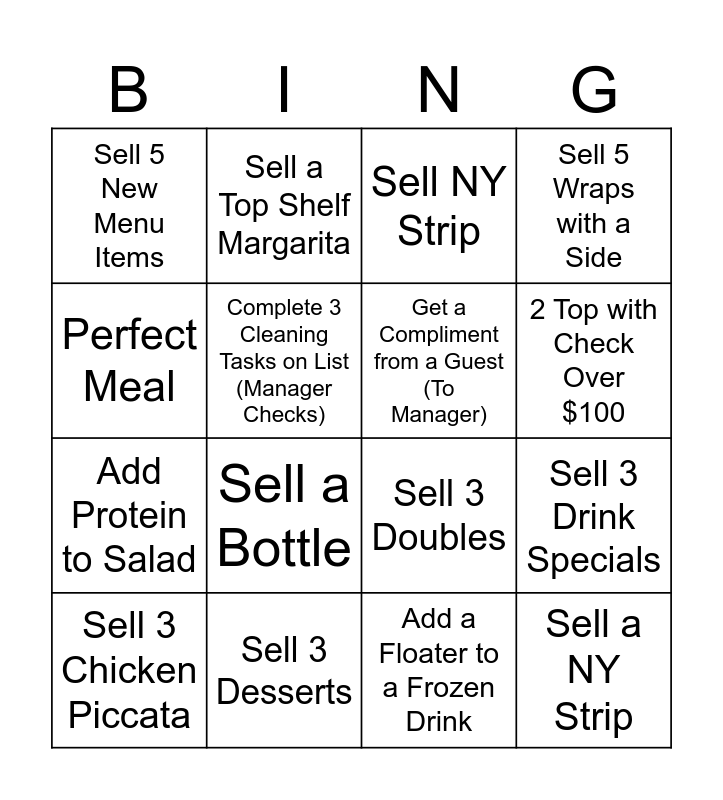 This bingo card has 16 words: Sell 3 Desserts, Sell 3 Drink Specials, Sell NY Strip, Sell 5 New Menu Items, Add Protein to Salad, Sell a Top Shelf Margarita, Sell 3 Doubles, Add a Floater to a Frozen Drink, Perfect Meal, Complete 3 Cleaning Tasks on List (Manager Checks), Sell 3 Chicken Piccata, Sell 5 Wraps with a Side, Sell a Bottle, 2 Top with Check Over $100, Get a Compliment from a Guest (To Manager) and Sell a NY Strip.