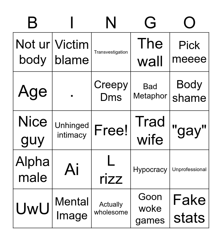 This bingo card has a free space and 24 words: Ai, Mental Image, Creepy Dms, UwU, Pick meeee, Not ur body, Age, Victim blame, Trad wife, L rizz, Bad Metaphor, Nice guy, Hypocracy, Unprofessional, ., Goon woke games, "gay", Transvestigation, Body shame, Unhinged intimacy, Fake stats, Alpha male, The wall and Actually wholesome.