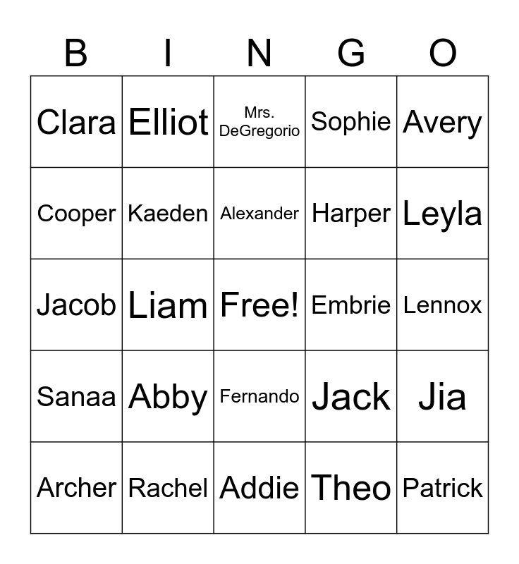 This bingo card has a free space and 25 words: Abby, Addie, Alexander, Archer, Avery, Clara, Cooper, Elliot, Embrie, Fernando, Harper, Jacob, Jack, Jia, Kaeden, Kuba, Lennox, Mrs. DeGregorio, Leyla, Liam, Patrick, Rachel, Sanaa, Sophie and Theo.
