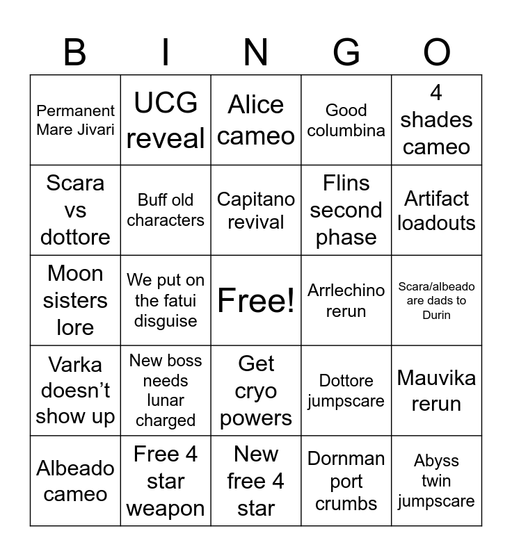 This bingo card has a free space and 47 words: Genshin concert, Abyss twin jumpscare, New endgame, New free 4 star, New boss needs lunar charged, Someone makes a bad joke, UCG reveal, Dawei cameo, Scara vs dottore, Katherine is evil, Buff old characters, Good columbina, Mauvika rerun, Dottore jumpscare, We meet varka in bar/drunk, Bad columbina, Capitano revival, Arrlechino rerun, Flins first phase, 4 shades cameo, We put on the fatui disguise, Dornman port crumbs, Permanent Mare Jivari, Flins second phase, Resin cap increased, Artifact loadouts, Albeado cameo, No cryo powers, Get cryo powers, Varka doesn’t show up, Dottore doesn’t show up, Fontaine cronical wish, Festival event, Bad anniversary awards, Good anniversary awards, Free 4 star weapon, Scara/albeado are dads to Durin, Anime news, Irl event, Collaboration, Thoma’s mom, Alice cameo, Moon sisters lore, We can ride the deer, Yelan cameo, Cool npc shows up and Childe cameo.