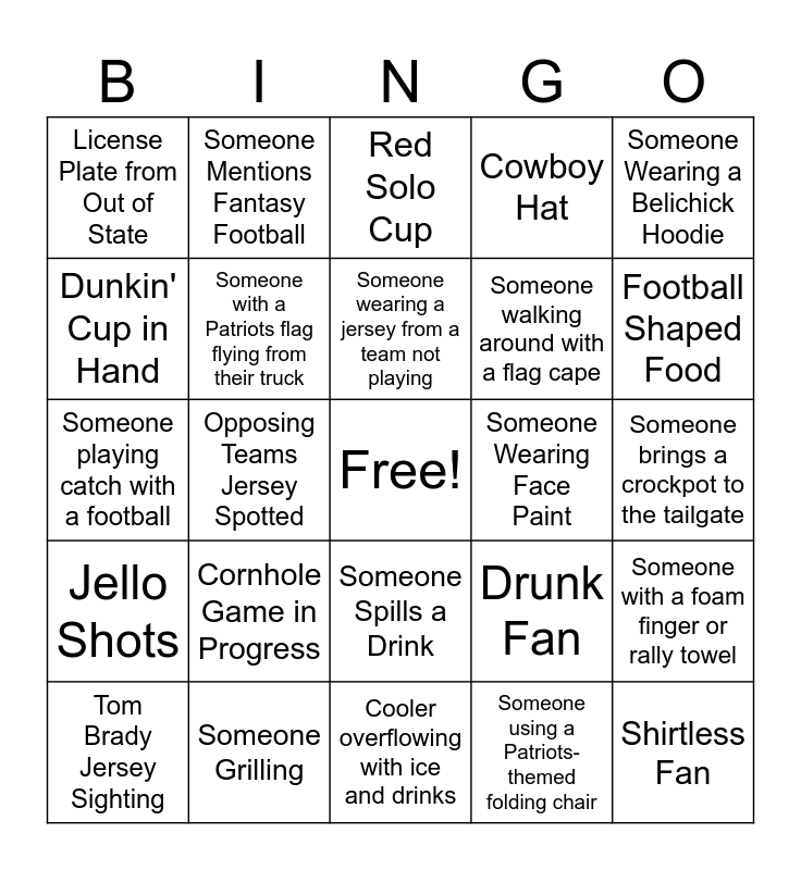 This bingo card has a free space and 24 words: Cornhole Game in Progress, Someone Grilling, Someone wearing a jersey from a team not playing, Tom Brady Jersey Sighting, Someone Wearing a Belichick Hoodie, License Plate from Out of State, Dunkin' Cup in Hand, Someone Mentions Fantasy Football, Someone Wearing Face Paint, Someone Spills a Drink, Someone walking around with a flag cape, Someone playing catch with a football, Drunk Fan, Someone with a foam finger or rally towel, Someone with a Patriots flag flying from their truck, Someone using a Patriots-themed folding chair, Someone brings a crockpot to the tailgate, Red Solo Cup, Football Shaped Food, Opposing Teams Jersey Spotted, Shirtless Fan, Jello Shots, Cowboy Hat and Cooler overflowing with ice and drinks.