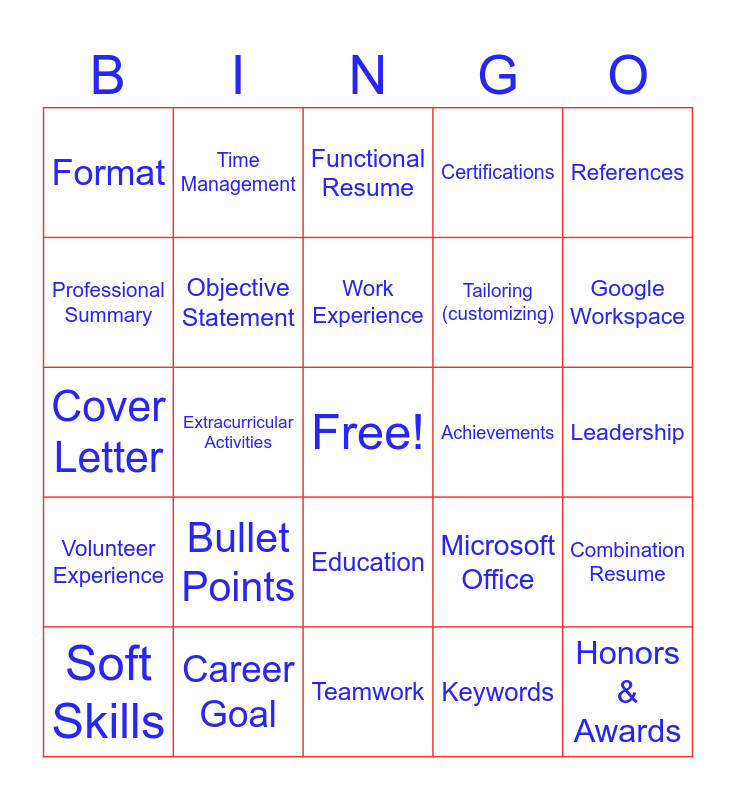 This bingo card has a free space and 40 words: Resume, Cover Letter, Contact Information, Objective Statement, Career Goal, Education, Work Experience, Skills, References, Volunteer Experience, Extracurricular Activities, Certifications, Honors & Awards, Leadership, Achievements, Bullet Points, Action Verbs, Format, Chronological Resume, Functional Resume, Combination Resume, Keywords, Tailoring (customizing), Professional Summary, GPA, Internship, Job Title, Company Name, Dates of Employment, Responsibilities, Accomplishments, Soft Skills, Hard Skills, Microsoft Office, Google Workspace, Teamwork, Communication, Problem Solving, Time Management and References Available Upon Request.