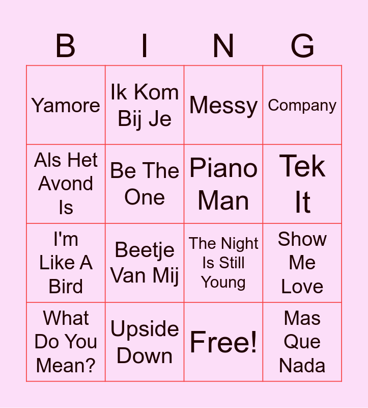 This bingo card has 16 words: What Do You Mean?, Upside Down, Messy, Company, Als Het Avond Is, Ik Kom Bij Je, The Night Is Still Young, Show Me Love, Yamore, Be The One, Free!, Tek It, I'm Like A Bird, Beetje Van Mij, Piano Man and Mas Que Nada.