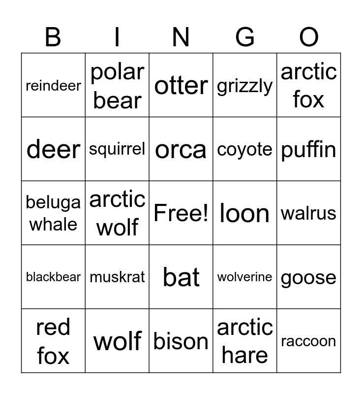 This bingo card has a free space and 42 words: pig, orca, whooping crane, muskrat, arctic hare, goose, raccoon, cow, otter, bat, walrus, puffin, arctic wolf, arctic fox, beaver, wolverine, goat, beluga whale, musk ox, polar bear, deer, monarch butterfly, bear, reindeer, moose, seal, coyote, mule deer, lynx, cougar, hummingbird, blackbear, squirrel, bison, elk, red fox, wolf, loon, bob cat, big horn sheep, grizzly and ground hog.