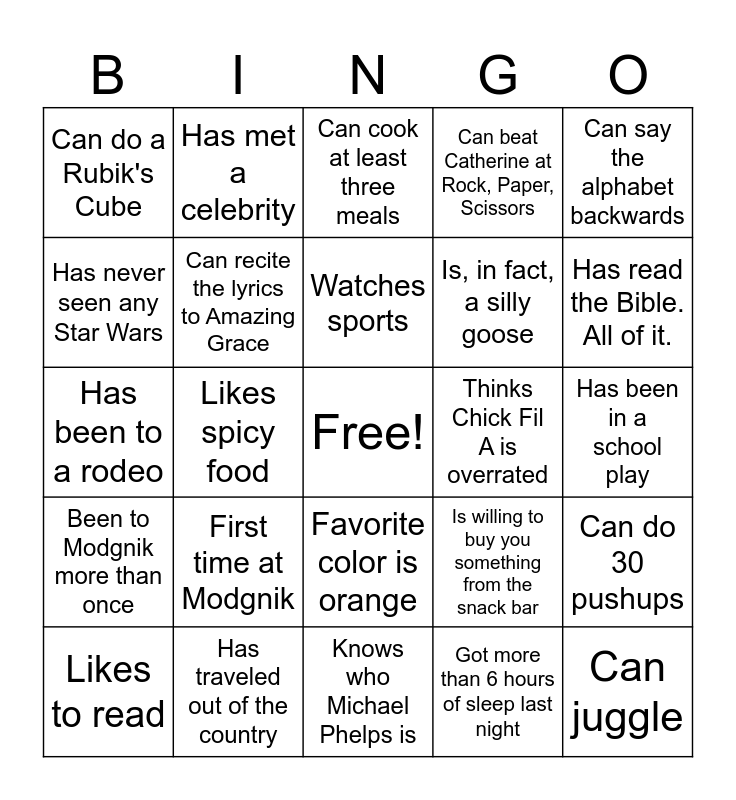 This bingo card has a free space and 24 words: First time at Modgnik, Has traveled out of the country, Watches sports, Likes to read, Can say the alphabet backwards, Can do a Rubik's Cube, Has never seen any Star Wars, Has met a celebrity, Thinks Chick Fil A is overrated, Favorite color is orange, Is, in fact, a silly goose, Has been to a rodeo, Is willing to buy you something from the snack bar, Can do 30 pushups, Can recite the lyrics to Amazing Grace, Got more than 6 hours of sleep last night, Has been in a school play, Can cook at least three meals, Has read the Bible. All of it., Likes spicy food, Can juggle, Been to Modgnik more than once, Can beat Catherine at Rock, Paper, Scissors and Knows who Michael Phelps is.