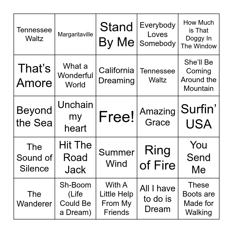 This bingo card has a free space and 76 words: Dancing Queen, Voulez Vous, Stand By Me, Sweet Caroline, 9-5, Fly Me To The Moon, You Are My Sunshine, Somewhere Over the Rainbow, Que Sera, Sera, Yellow Submarine, Can’t Help Falling in Love, Edelweiss, Amazing Grace, She’ll Be Coming Around the Mountain, Singing in the Rain, What a Wonderful World, Blue Suede Shoes, Ring of Fire, Leaving on a Jet Plane, That’s Amore, Under the Boardwalk, California Dreaming, Tennessee Waltz, How Much is That Doggy In The Window, Tennessee Waltz, Lollipop, All Shook Up, Walkin’ After Midnight, Crazy, Put Your Head On My Shoulder, Mr. Sandman, I Walk The Line, Rockin’ Robin, You Send Me, Beyond the Sea, Margaritaville, Dream Lover, Jailhouse Rock, Surfin’ USA, The Wanderer, At The Hop, At Last, I Say A Little Prayer, Oh, Pretty Woman, It’s A Long Way To Tipperary, Sh-Boom (Life Could Be a Dream), Be My Baby, Everybody Loves Somebody, Hound Dog, My Way, King of the Road, Let Me Call You Sweetheart, Mamma Mia!, These Boots are Made for Walking, I’m a Believer, Wild Thing, Lucille, Yesterday, Let It Be, Cracklin’ Rosie, Unchain my heart, Could I have this Dance, What’s Love Got to Do With It?, Country Roads, Love Me Tender, Bennie and The Jets, With A Little Help From My Friends, My Heart Will Go On, Ain’t That a Kick in The Head, Welcome To My World, Hit The Road Jack, Summer Wind, All I have to do is Dream, Rock Around the Clock, The Sound of Silence and Oh Carol.