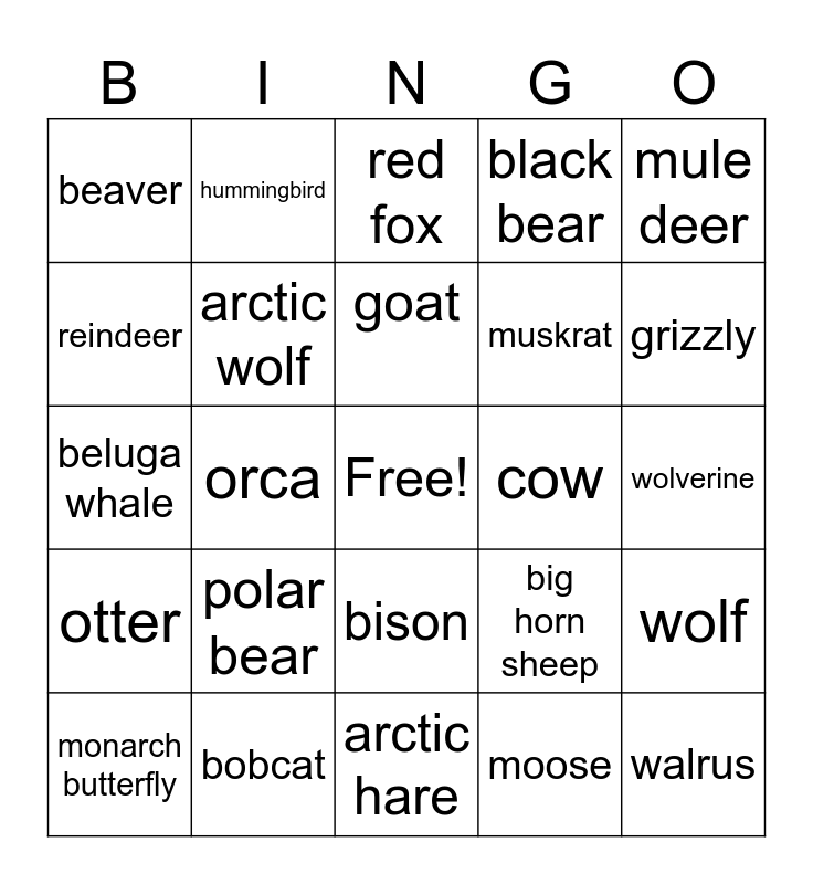 This bingo card has a free space and 42 words: deer, goat, pig, polar bear, moose, wolf, walrus, coyote, red fox, bison, wolverine, grizzly, orca, mule deer, raccoon, big horn sheep, goose, beluga whale, bat, hummingbird, reindeer, whooping crane, bear, beaver, squirrel, loon, muskrat, groundhog, elk, seal, cougar, otter, arctic wolf, arctic hare, lynx, monarch butterfly, bobcat, cow, musk ox, arctic fox, black bear and puffin.