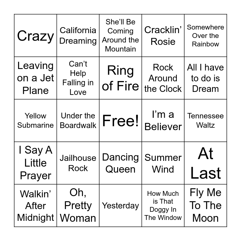 This bingo card has a free space and 76 words: Edelweiss, Amazing Grace, She’ll Be Coming Around the Mountain, Singing in the Rain, What a Wonderful World, Blue Suede Shoes, Hound Dog, My Way, King of the Road, Let Me Call You Sweetheart, Mamma Mia!, These Boots are Made for Walking, Ring of Fire, Leaving on a Jet Plane, That’s Amore, Under the Boardwalk, 9-5, Fly Me To The Moon, You Are My Sunshine, Somewhere Over the Rainbow, Que Sera, Sera, Yellow Submarine, Can’t Help Falling in Love, California Dreaming, Cracklin’ Rosie, Unchain my Heart, Could I have this Dance, What’s Love Got to Do With It?, Country Roads, Love Me Tender, Bennie and The Jets, Welcome To My World, Hit The Road Jack, Summer Wind, All I have to do is Dream, Rock Around the Clock, The Sound of Silence, Oh Carol, Tennessee Waltz, How Much is That Doggy In The Window, Tennessee Waltz, With A Little Help From My Friends, My Heart Will Go On, Ain’t That a Kick in The Head, Lollipop, All Shook Up, Walkin’ After Midnight, Crazy, Put Your Head On My Shoulder, Mr. Sandman, I Walk The Line, Dancing Queen, Voulez Vous, Stand By Me, Sweet Caroline, Rockin’ Robin, You Send Me, Beyond the Sea, Margaritaville, Dream Lover, Jailhouse Rock, Surfin’ USA, It’s A Long Way To Tipperary, Sh-Boom (Life Could Be a Dream), Be My Baby, Everybody Loves Somebody, I’m a Believer, Wild Thing, The Wanderer, At The Hop, At Last, I Say A Little Prayer, Oh, Pretty Woman, Lucille, Yesterday and Let It Be..