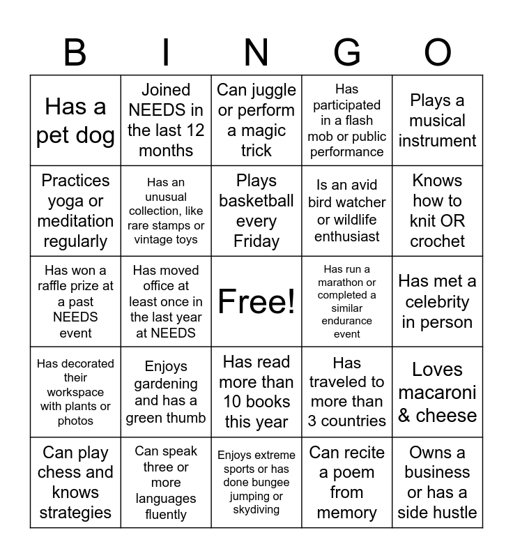 This bingo card has a free space and 24 words: Enjoys gardening and has a green thumb, Can speak three or more languages fluently, Plays basketball every Friday, Can play chess and knows strategies, Plays a musical instrument, Has a pet dog, Practices yoga or meditation regularly, Joined NEEDS in the last 12 months, Has run a marathon or completed a similar endurance event, Has read more than 10 books this year, Is an avid bird watcher or wildlife enthusiast, Has won a raffle prize at a past NEEDS event, Has traveled to more than 3 countries, Loves macaroni & cheese, Has an unusual collection, like rare stamps or vintage toys, Can recite a poem from memory, Has met a celebrity in person, Can juggle or perform a magic trick, Knows how to knit OR crochet, Has moved office at least once in the last year at NEEDS, Owns a business or has a side hustle, Has decorated their workspace with plants or photos, Has participated in a flash mob or public performance and Enjoys extreme sports or has done bungee jumping or skydiving.