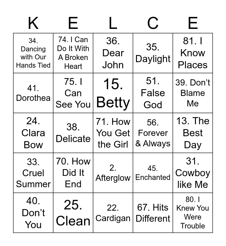 This bingo card has 91 words: Free!, 1. 22, 2. Afterglow, 3. The Albatross, 4. The Alchemy, 5. All You Had To Do Was Stay, 6. Anti-Hero, 7. The Archer, 8. August, 9. Back to December, 10. Bad Blood, 11. Begin Again, 12. Bejeweled, 13. The Best Day, 14. Better Than Revenge, 15. Betty, 16. Bigger Than the Whole Sky, 17. The Black Dog, 18. Blank Space, 19. The Bolter, 20. Breathe, 21. Call It What You Want, 22. Cardigan, 23. Champagne Problems, 24. Clara Bow, 25. Clean, 26. Closure, 27. Cold as You, 28. Come Back…Be Here, 29. Coney Island, 30. Cornelia Street, 31. Cowboy like Me, 32. Crazier, 33. Cruel Summer, 34. Dancing with Our Hands Tied, 35. Daylight, 36. Dear John, 37. Death by a Thousand Cuts, 38. Delicate, 39. Don’t Blame Me, 40. Don’t You, 41. Dorothea, 42. Down Bad, 43. Dress, 44. Electric Touch, 45. Enchanted, 46. End Game, 47. Epiphany, 48. Evermore, 49. Everything Has Changed, 50. Exile, 51. False God, 52. Fearless, 53. Fifteen, 54. Florida!!!, 55. Foolish One, 56. Forever & Always, 57. Fortnight, 58. Fresh Out the Slammer, 59. Getaway Car, 60. Gold Rush, 61. Gorgeous, 62. The Great War, 63. Guilty as Sin?, 64. Happiness, 65. Hey Stephen, 66. High Infidelity, 67. Hits Different, 68. Hoax, 69. Holy Ground, 70. How Did It End, 71. How You Get the Girl, 72. I Almost Do, 73. I Bet You Think About Me, 74. I Can Do It With A Broken Heart, 75. I Can See You, 76. I Can Fix Him (No Really I Can), 77. I Did Something Bad, 78. I Forgot That You Existed, 79. I Hate It HereI Look In People’s Windows, 80. I Knew You Were Trouble, 81. I Know Places, 82. I Think He Knows, 83. I Wish You Would, 84. If This Was a Movie, 85. Illicit Affairs, 86. I’m Only Me When I’m With You, 87. Imgonnagetyouback, 88. Innocent, 89. Invisible and 90. Invisible String.