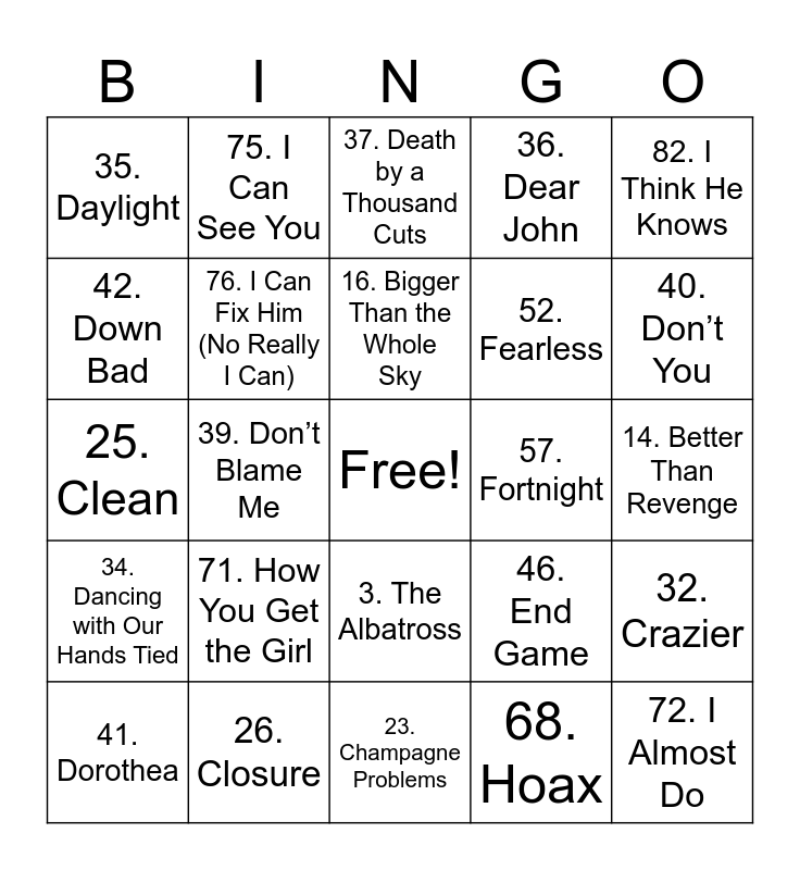 This bingo card has a free space and 90 words: 1. 22, 2. Afterglow, 3. The Albatross, 4. The Alchemy, 5. All You Had To Do Was Stay, 6. Anti-Hero, 7. The Archer, 8. August, 9. Back to December, 10. Bad Blood, 11. Begin Again, 12. Bejeweled, 13. The Best Day, 14. Better Than Revenge, 15. Betty, 16. Bigger Than the Whole Sky, 17. The Black Dog, 18. Blank Space, 19. The Bolter, 20. Breathe, 21. Call It What You Want, 22. Cardigan, 23. Champagne Problems, 24. Clara Bow, 25. Clean, 26. Closure, 27. Cold as You, 28. Come Back…Be Here, 29. Coney Island, 30. Cornelia Street, 31. Cowboy like Me, 32. Crazier, 33. Cruel Summer, 34. Dancing with Our Hands Tied, 35. Daylight, 36. Dear John, 37. Death by a Thousand Cuts, 38. Delicate, 39. Don’t Blame Me, 40. Don’t You, 41. Dorothea, 42. Down Bad, 43. Dress, 44. Electric Touch, 45. Enchanted, 46. End Game, 47. Epiphany, 48. Evermore, 49. Everything Has Changed, 50. Exile, 51. False God, 52. Fearless, 53. Fifteen, 54. Florida!!!, 55. Foolish One, 56. Forever & Always, 57. Fortnight, 58. Fresh Out the Slammer, 59. Getaway Car, 60. Gold Rush, 61. Gorgeous, 62. The Great War, 63. Guilty as Sin?, 64. Happiness, 65. Hey Stephen, 66. High Infidelity, 67. Hits Different, 68. Hoax, 69. Holy Ground, 70. How Did It End, 71. How You Get the Girl, 72. I Almost Do, 73. I Bet You Think About Me, 74. I Can Do It With A Broken Heart, 75. I Can See You, 76. I Can Fix Him (No Really I Can), 77. I Did Something Bad, 78. I Forgot That You Existed, 79. I Hate It HereI Look In People’s Windows, 80. I Knew You Were Trouble, 81. I Know Places, 82. I Think He Knows, 83. I Wish You Would, 84. If This Was a Movie, 85. Illicit Affairs, 86. I’m Only Me When I’m With You, 87. Imgonnagetyouback, 88. Innocent, 89. Invisible and 90. Invisible String.