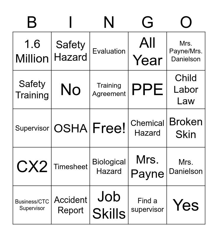 This bingo card has a free space and 24 words: Timesheet, Accident Report, Training Agreement, Business/CTC Supervisor, Mrs. Payne/Mrs. Danielson, 1.6 Million, Safety Training, Safety Hazard, Chemical Hazard, Biological Hazard, PPE, Supervisor, Mrs. Payne, Mrs. Danielson, No, Find a supervisor, Broken Skin, Evaluation, Child Labor Law, OSHA, Yes, CX2, All Year and Job Skills.