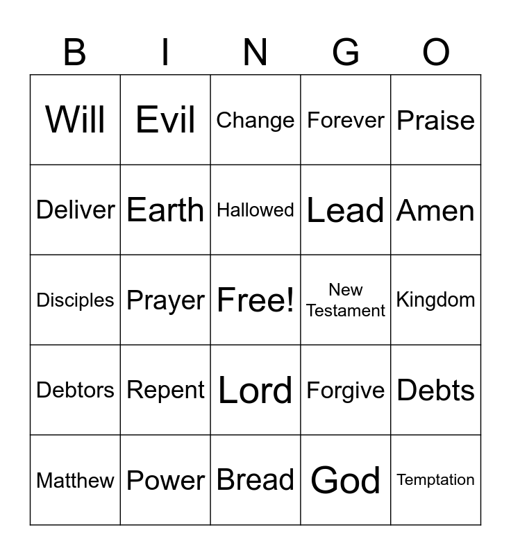 This bingo card has a free space and 33 words: Father, Name, Hallowed, Heaven, Kingdom, Will, Earth, Bread, Lead, Temptation, Deliver, Evil, God, Jesus, Disciples, Prayer, Lord, Forgive, Debts, Debtors, Power, Glory, Forever, Amen, Bible, Repent, Change, New Testament, Praise, Matthew, Savior, Children and Blessings.