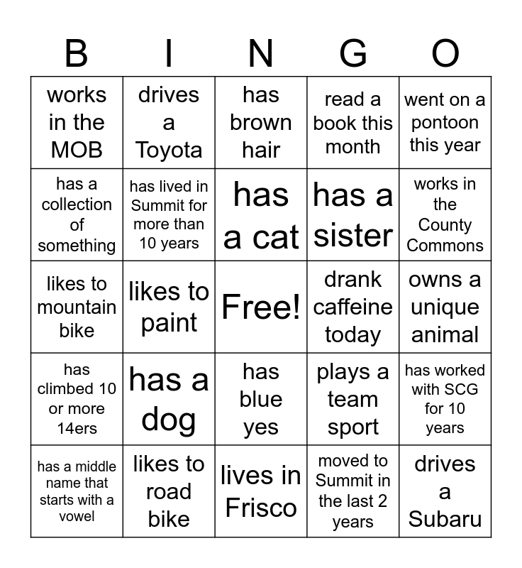 This bingo card has a free space and 37 words: works in a different department than you, has hiked Royal and Buffalo, learned a new skill this year, has lived in Summit for more than 10 years, has worked with SCG for 10 years, has a dog, has a cat, has worked for 2 or more diff SCG departments, went on a pontoon this year, knows how to knit or crochet, likes to paint, read a book this month, drives a Subaru, owns a unique animal, has a collection of something, has climbed 10 or more 14ers, has used Summit Stage this year, has brown hair, has blue yes, drank caffeine today, works in the MOB, works in the County Commons, has a middle name that starts with a vowel, lives in Frisco, lives in Dillon, moved to Summit in the last 2 years, drives a Toyota, rode their bike to work, has visited another country, has been to Rocky Mountain National Park, saw a show at Dillon Amp this summer, likes to road bike, likes to mountain bike, knows how to teleski, plays a team sport, has a sister and has a brother.
