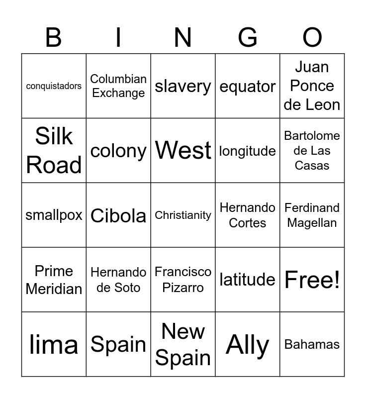 This bingo card has 26 words: Francisco Pizarro, Ally, West, Spain, Juan Ponce de Leon, conquistadors, Silk Road, Columbian Exchange, Ferdinand Magellan, latitude, longitude, smallpox, Free!, lima, Cibola, Amerigo Vespucci, equator, Prime Meridian, slavery, Christianity, Bartolome de Las Casas, New Spain, Hernando Cortes, Hernando de Soto, colony and Bahamas.