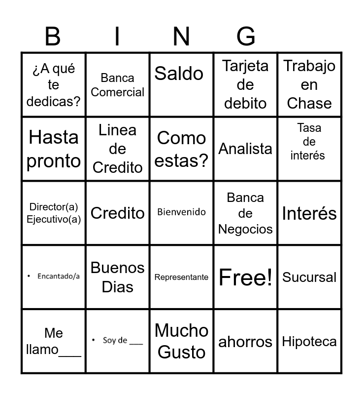 This bingo card has 3 images and 22 words: Buenos Dias, Mucho Gusto, Como estas?, Me llamo___, Trabajo en Chase, ¿A qué te dedicas?, Hasta pronto, Banca Comercial, Banca de Negocios, Representante, Analista, Director(a) Ejecutivo(a), Free!, Sucursal, Linea de Credito, Hipoteca, Interés, Saldo, Tasa de interés, Credito, Tarjeta de debito and ahorros.