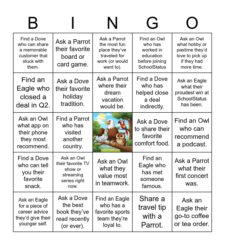 This bingo card has a free space and 24 words: Ask an Owl their favorite TV show or streaming series right now., Ask a Dove the best book they’ve read recently (or ever)., Ask a Parrot where their dream vacation would be., Ask an Eagle for a piece of career advice they’d give their younger self., Ask an Owl what hobby or pastime they’d love to pick up if they had more time., Find a Dove who can share a memorable customer that stuck with them., Find an Eagle who closed a deal in Q2., Ask a Parrot their favorite board or card game., Ask a Dove to share their favorite comfort food., Ask an Owl what they value most in teamwork., Find a Dove who has helped close a deal indirectly., Ask an Owl what app on their phone they most recommend., Find an Eagle who has met someone famous., Ask a Parrot what their first concert was., Ask a Dove their favorite holiday tradition., Share a travel tip with a Parrot., Find an Owl who can recommend a podcast., Ask a Parrot the most fun place they’ve traveled for work (or would want to)., Ask an Eagle what their proudest win at SchoolStatus has been., Find a Parrot who has visited another country., Ask an Eagle their go-to coffee or tea order., Find a Dove who can tell you their favorite snack., Find an Owl who has worked in education before joining SchoolStatus and Find an Eagle who has a favorite sports team they’re loyal to..