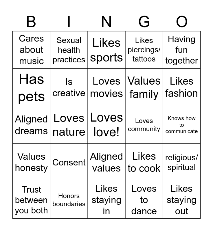 This bingo card has a free space and 24 words: Consent, Honors boundaries, Loves movies, Trust between you both, Having fun together, Cares about music, Has pets, Sexual health practices, Loves community, Aligned values, Values family, Aligned dreams, Likes to cook, religious/ spiritual, Is creative, Loves to dance, Knows how to communicate, Likes sports, Likes fashion, Loves nature, Likes staying out, Values honesty, Likes piercings/ tattoos and Likes staying in.