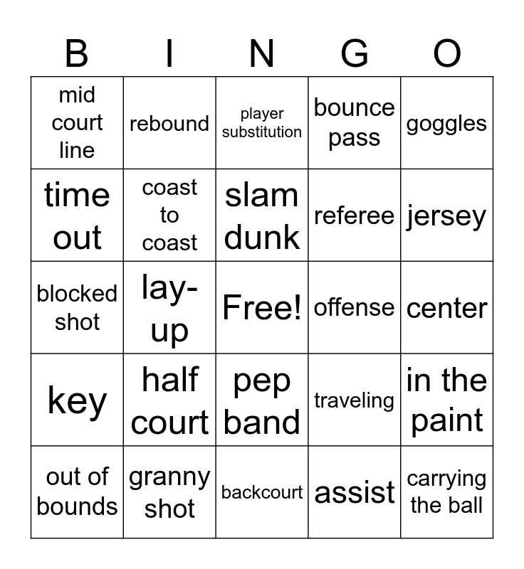 This bingo card has a free space and 75 words: airball, missed free throw, player substitution, mouth guard, jump ball, towel, water boy/girl, coach, cheerleaders, buzzer beater, knee brace, technical foul, slam dunk, time out, mascot, lay-up, 5-second violation, carrying the ball, three pointer, goggles, center circle, blocked shot, coast to coast, rebound, bounce pass, turnover, drive, foul, free throw, score board, foam finger, full court, dribbling, traveling, jersey, referee, whistle, net, center, assist, bank shot, alley-oop, backboard, zone defense, shot clock, pivot, out of bounds, mid court line, jump shot, hoop, fake, pep band, intentional foul, personal foul, tip off, starting lineup, reverse dribble, fight song, basketball, between-the-legs dribble, half court, bench, double dribble, no look pass, defense, offense, point guard, steal, swish, in the paint, key, granny shot, front court, backcourt and basket interference.