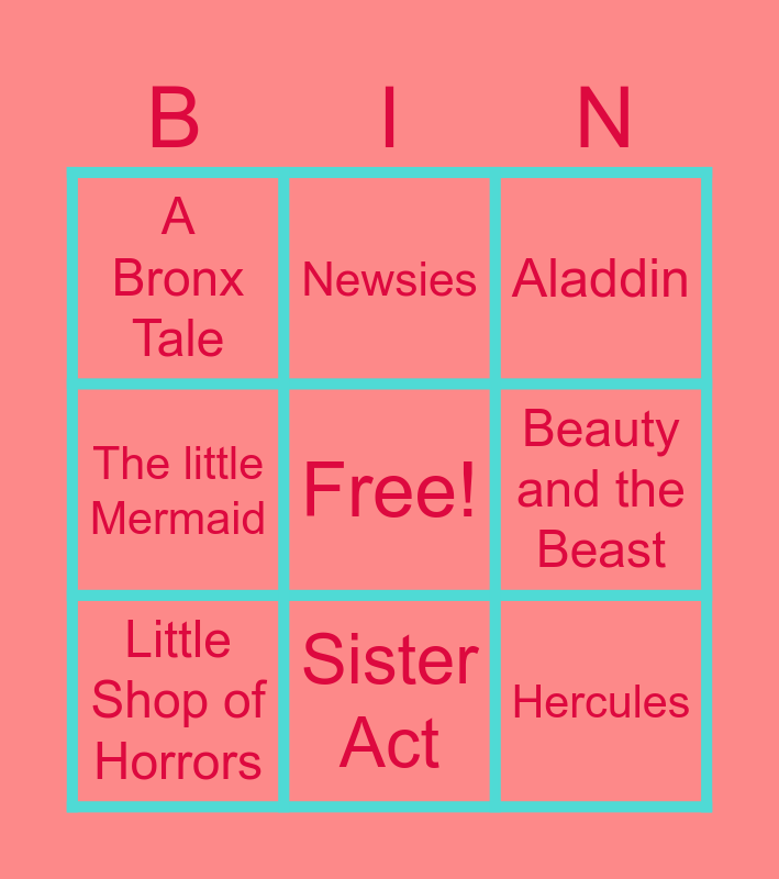 This bingo card has a free space and 8 words: Beauty and the Beast, Aladdin, Newsies, Little Shop of Horrors, A Bronx Tale, Hercules, The little Mermaid and Sister Act.