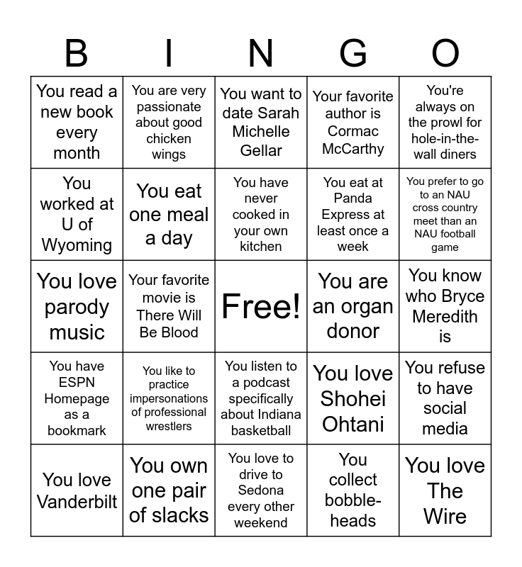 This bingo card has a free space and 24 words: You love Vanderbilt, You like to practice impersonations of professional wrestlers, You have never cooked in your own kitchen, You collect bobble-heads, You're always on the prowl for hole-in-the-wall diners, You read a new book every month, You are very passionate about good chicken wings, You want to date Sarah Michelle Gellar, You are an organ donor, You know who Bryce Meredith is, You love parody music, You eat one meal a day, You love Shohei Ohtani, You refuse to have social media, You worked at U of Wyoming, You own one pair of slacks, You love to drive to Sedona every other weekend, Your favorite author is Cormac McCarthy, You prefer to go to an NAU cross country meet than an NAU football game, You have ESPN Homepage as a bookmark, Your favorite movie is There Will Be Blood, You listen to a podcast specifically about Indiana basketball, You eat at Panda Express at least once a week and You love The Wire.