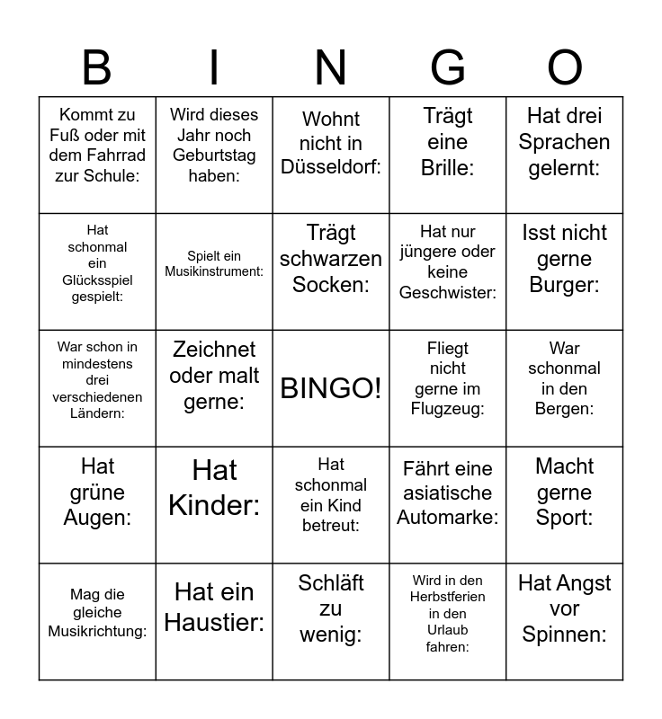 This bingo card has a free space and 24 words: Hat Kinder:, Hat ein Haustier:, Trägt schwarzen Socken:, Mag die gleiche Musikrichtung:, Hat drei Sprachen gelernt:, Kommt zu Fuß oder mit dem Fahrrad zur Schule:, Hat schonmal ein Glücksspiel gespielt:, Wird dieses Jahr noch Geburtstag haben:, Fliegt nicht gerne im Flugzeug:, Hat schonmal ein Kind betreut:, Hat nur jüngere oder keine Geschwister:, War schon in mindestens drei verschiedenen Ländern:, Fährt eine asiatische Automarke:, Macht gerne Sport:, Spielt ein Musikinstrument:, Wird in den Herbstferien in den Urlaub fahren:, War schonmal in den Bergen:, Wohnt nicht in Düsseldorf:, Isst nicht gerne Burger:, Zeichnet oder malt gerne:, Hat Angst vor Spinnen:, Hat grüne Augen:, Trägt eine Brille: and Schläft zu wenig:.