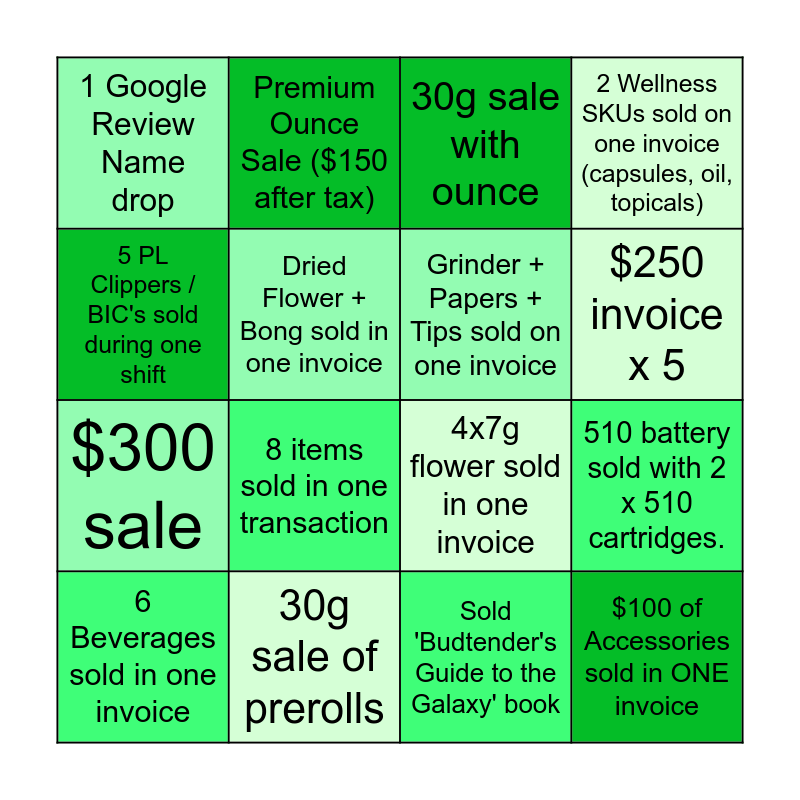 This bingo card has 16 words: 30g sale of prerolls, 510 battery sold with 2 x 510 cartridges., 30g sale with ounce, 1 Google Review Name drop, $300 sale, Premium Ounce Sale ($150 after tax), 4x7g flower sold in one invoice, Sold 'Budtender's Guide to the Galaxy' book, 5 PL Clippers / BIC's sold during one shift, Dried Flower + Bong sold in one invoice, 6 Beverages sold in one invoice, 2 Wellness SKUs sold on one invoice (capsules, oil, topicals), 8 items sold in one transaction, $250 invoice x 5, Grinder + Papers + Tips sold on one invoice and $100 of Accessories sold in ONE invoice.