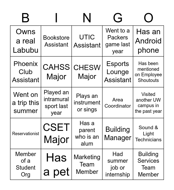 This bingo card has 27 words: Building Manager, Building Services Team Member, Esports Lounge Assistant, Marketing Team Member, Phoenix Club Assistant, UTIC Assistant, Bookstore Assistant, Reservationist, Area Coordinator, Sound & Light Technicians, Went on a trip this summer, Went to a Packers game last year, Member of a Student Org, Has a pet, Has been mentioned on Employee Shoutouts, CSB Major, CAHSS Major, CHESW Major, CSET Major, Owns a real Labubu, Visited another UW campus in the past year, Had summer job or internship, Played an intramural sport last year, Plays an instrument or sings, Has a parent who is an alum, Has an Android phone and Has worked more than 1 student job at UWGB.