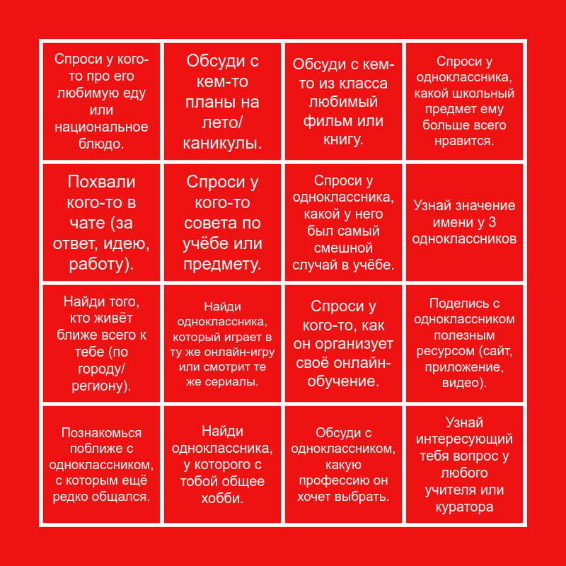This bingo card has 16 words: Познакомься поближе с одноклассником, с которым ещё редко общался., Найди одноклассника, у которого с тобой общее хобби., Обсуди с кем-то из класса любимый фильм или книгу., Спроси у одноклассника, какой школьный предмет ему больше всего нравится., Похвали кого-то в чате (за ответ, идею, работу)., Обсуди с кем-то планы на лето/каникулы., Спроси у кого-то, как он организует своё онлайн-обучение., Поделись с одноклассником полезным ресурсом (сайт, приложение, видео)., Спроси у кого-то про его любимую еду или национальное блюдо., Спроси у кого-то совета по учёбе или предмету., Обсуди с одноклассником, какую профессию он хочет выбрать., Узнай значение имени у 3 одноклассников, Найди того, кто живёт ближе всего к тебе (по городу/региону)., Найди одноклассника, который играет в ту же онлайн-игру или смотрит те же сериалы., Спроси у одноклассника, какой у него был самый смешной случай в учёбе. and Узнай интересующий тебя вопрос у любого учителя или куратора.