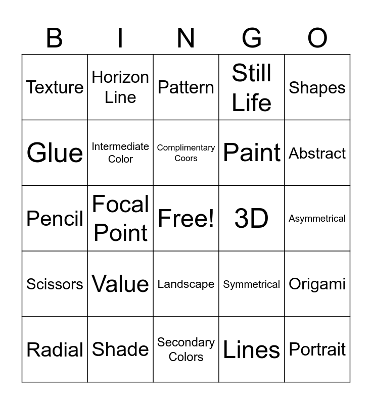 This bingo card has a free space and 29 words: Radial, 2D, Focal Point, Tint, Texture, Pattern, Intermediate Color, Value, 3D, Shade, Asymmetrical, Portrait, Secondary Colors, Lines, Abstract, Primary Colors, Landscape, Scissors, Shapes, Pencil, Symmetrical, Sculpture, Paint, Glue, Still Life, Horizon Line, Origami, Complimentary Coors and Mural.