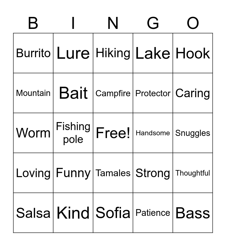 This bingo card has a free space and 75 words: Camper, Tent, Hiking, Nature, Firewood, Lantern, Backpack, Sleeping bag, Stars, Trail, Boots, River, Campfire, Mountain, Sunrise, Fishing pole, Tackle, Bass, Trout, Hook, Reel, Worm, Bait, Lure, Lake, Net, Catch, Line, Favorite child, Big fish, Dad, Love, Proud, Strong, Caring, Protector, Diapers, Stroller, Snuggles, Patience, Laughter, Soli, Scooby, Bottle, Birdie, Tacos, Salsa, Burrito, Guacamole, Chips, Enchilada, Tamales, Menudo, Nachos, Jalepeno, Tortilla, Pozole, Carne asada, Fajitas, Horchata, Funny, Loyal, Patient, Adventurous, Hardworking, Handsome, Brave, Gentle, Dedicated, Thoughtful, Loving, Kind, Generous, Sofia and Sparky.
