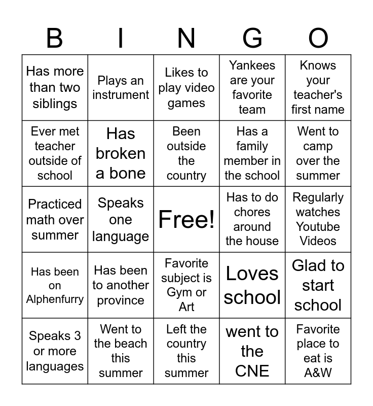 This bingo card has a free space and 29 words: Speaks 3 or more languages, Likes to sleep, Speaks one language, Reads manga & watches anime, Has more than two siblings, Likes to play video games, Has broken a bone, Has been to another province, Has to do chores around the house, Went to the beach this summer, Regularly watches Youtube Videos, Favorite place to eat is A&W, Left the country this summer, went to the CNE, Went to camp over the summer, Favorite subject is Math, Favorite subject is Gym or Art, Has been on Alphenfurry, Knows your teacher's first name, Practiced math over summer, Loves school, Prefers cats over dogs, Has a family member in the school, Ever met teacher outside of school, Yankees are your favorite team, Plays an instrument, Glad to start school, Been outside the country and Like to play sports.
