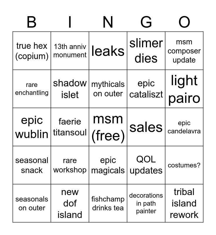 This bingo card has a free space and 24 words: rare workshop, new dof island, mythicals on outer, seasonals on outer, msm composer update, true hex (copium), rare enchantling, 13th anniv monument, sales, epic magicals, epic cataliszt, epic wublin, QOL updates, costumes?, shadow islet, decorations in path painter, epic candelavra, leaks, light pairo, faerie titansoul, tribal island rework, seasonal snack, slimer dies and fishchamp drinks tea.