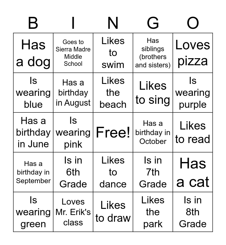This bingo card has a free space and 24 words: Is in 6th Grade, Loves Mr. Erik's class, Likes the beach, Is wearing green, Loves pizza, Has a dog, Is wearing blue, Goes to Sierra Madre Middle School, Has a birthday in October, Likes to dance, Likes to sing, Has a birthday in June, Is in 7th Grade, Has a cat, Has a birthday in August, Likes the park, Likes to read, Likes to swim, Is wearing purple, Is wearing pink, Is in 8th Grade, Has a birthday in September, Has siblings (brothers and sisters) and Likes to draw.