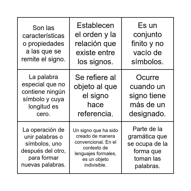 This bingo card has 23 words: Se define como el conjunto de signos (palabras) y las reglas que los organizan., Es un concepto abstracto que permite hacer referencia a objetos., Un signo que ha sido creado de manera convencional. En el contexto de lenguajes formales, es un objeto indivisible., Es el proceso mediante el cual se toma un objeto como un signo de algo., Se refiere al objeto al que el signo hace referencia., Son las características o propiedades a las que se remite el signo., Ocurre cuando un signo tiene más de un designado., Establecen el orden y la relación que existe entre los signos., Relacionan los signos con sus respectivos significados., Vinculan los signos directamente con sus usuarios., Se compone de la morfología, la sintaxis y la fonética de los lenguajes., Parte de la gramática que se ocupa de la forma que toman las palabras., Se ocupa de la expresión oral de las palabras., Es el lenguaje que utilizan los seres humanos para comunicarse en la vida cotidiana, caracterizado por su ambigüedad y flexibilidad., Es un conjunto de símbolos y reglas bien definidas que no admiten ambigüedad, utilizado en áreas como las matemáticas y la computación., Se refiere al estudio de los lenguajes utilizando herramientas y conceptos matemáticos., Es un conjunto finito y no vacío de símbolos., Una secuencia finita de símbolos pertenecientes a un alfabeto., La operación de unir palabras o símbolos, uno después del otro, para formar nuevas palabras., Es la cantidad de símbolos que componen una palabra., La palabra especial que no contiene ningún símbolo y cuya longitud es cero., Se define como la concatenación de una palabra o símbolo consigo mismo un número n de veces. and Una palabra que se lee igual de izquierda a derecha que de derecha a izquierda; es decir, es igual a su refleja..