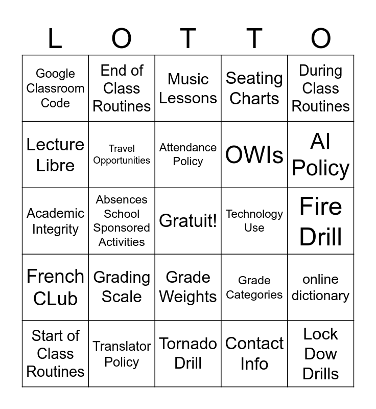This bingo card has a free space and 34 words: Class Activities, Contact Info, Supplies Needed, Important Dates, French CLub, Travel Opportunities, During Class Routines, Start of Class Routines, End of Class Routines, Home Expectations, Attendance Policy, Music Lessons, Food in Class, Leaving Class, Technology Use, AI Policy, Translator Policy, Academic Integrity, Grading Scale, Grade Categories, Grade Weights, 4 Language Skills, Google Classroom Code, Fire Drill, Tornado Drill, Lock Dow Drills, Seating Charts, Tardy Policy, OWIs, Lecture Libre, Calendar Chat, Absences School Sponsored Activities, online dictionary and Bathroom Breaks.