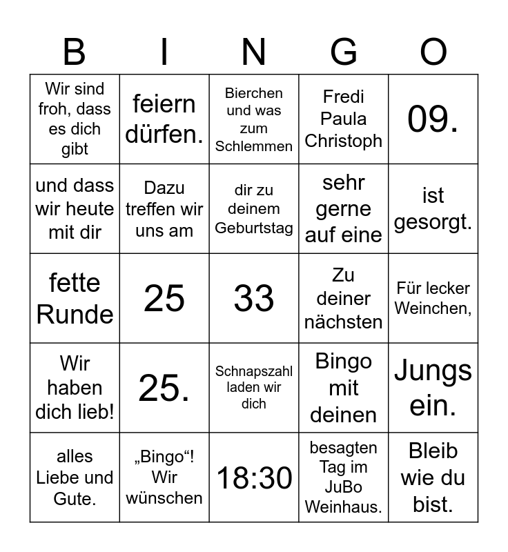 This bingo card has a free space and 24 words: 25., „Bingo“! Wir wünschen, dir zu deinem Geburtstag, alles Liebe und Gute., 09., Wir sind froh, dass es dich gibt, und dass wir heute mit dir, feiern dürfen., Zu deiner nächsten, Schnapszahl laden wir dich, sehr gerne auf eine, fette Runde, Bingo mit deinen, Jungs ein., Dazu treffen wir uns am, besagten Tag im JuBo Weinhaus., Für lecker Weinchen,, Bierchen und was zum Schlemmen, ist gesorgt., 25, Bleib wie du bist., Wir haben dich lieb!, Fredi Paula Christoph and 18:30.