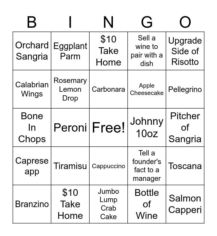 This bingo card has a free space and 24 words: Tiramisu, $10 Take Home, Carbonara, Branzino, Upgrade Side of Risotto, Orchard Sangria, Calabrian Wings, Eggplant Parm, Johnny 10oz, Cappuccino, Apple Cheesecake, Bone In Chops, Tell a founder's fact to a manager, Toscana, Rosemary Lemon Drop, Bottle of Wine, Pitcher of Sangria, $10 Take Home, Pellegrino, Peroni, Salmon Capperi, Caprese app, Sell a wine to pair with a dish and Jumbo Lump Crab Cake.