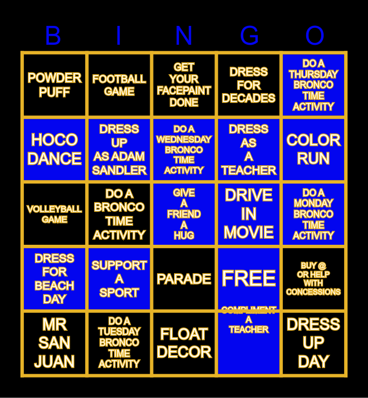 This bingo card has 25 words: SUPPORT A SPORT, FLOAT DECOR, DO A WEDNESDAY BRONCO TIME ACTIVITY, MR SAN JUAN, DO A THURSDAY BRONCO TIME ACTIVITY, POWDER PUFF, HOCO DANCE, FOOTBALL GAME, DRIVE IN MOVIE, PARADE, DRESS AS A TEACHER, VOLLEYBALL GAME, FREE, BUY @ OR HELP WITH CONCESSIONS, DRESS UP AS ADAM SANDLER, DRESS UP DAY, DO A MONDAY BRONCO TIME ACTIVITY, GET YOUR FACEPAINT DONE, COLOR RUN, DO A BRONCO TIME ACTIVITY, GIVE A FRIEND A HUG, DO A TUESDAY BRONCO TIME ACTIVITY, DRESS FOR BEACH DAY, DRESS FOR DECADES and COMPLIMENT A TEACHER.