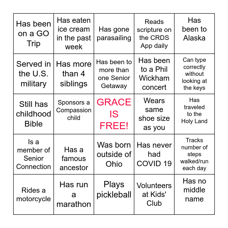 This bingo card has a free space and 24 words: Has a famous ancestor, Has run a marathon, Has been to more than one Senior Getaway, Rides a motorcycle, Has been to Alaska, Has been on a GO Trip, Served in the U.S. military, Has eaten ice cream in the past week, Wears same shoe size as you, Was born outside of Ohio, Has been to a Phil Wickham concert, Still has childhood Bible, Has never had COVID 19, Tracks number of steps walked/run each day, Has more than 4 siblings, Volunteers at Kids' Club, Has traveled to the Holy Land, Has gone parasailing, Can type correctly without looking at the keys, Sponsors a Compassion child, Has no middle name, Is a member of Senior Connection, Reads scripture on the CRDS App daily and Plays pickleball.