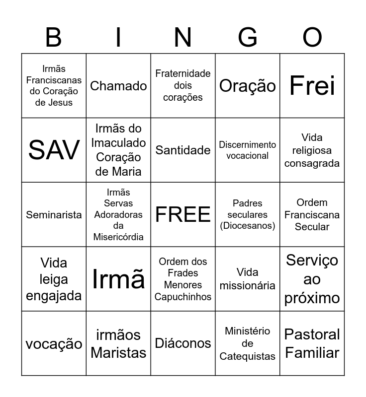 This bingo card has a free space and 30 words: irmãos Maristas, Instituto Missionário São José, Irmãs Servas Adoradoras da Misericórdia, Irmãs de Cristo Pastor, Irmãs Franciscanas do Coração de Jesus, Fraternidade dois corações, Irmãs do Imaculado Coração de Maria, Ordem dos Frades Menores Capuchinhos, Padres seculares (Diocesanos), Diáconos, Ordem Franciscana Secular, Pastoral Familiar, Ministério de Catequistas, Orientação Espiritual, Vida religiosa consagrada, Matrimônio, Vida missionária, Vida leiga engajada, Irmã, Frei, Seminarista, Ministro da eucaristia, Chamado, Discernimento vocacional, SAV, Oração, Serviço ao próximo, vocação, Santidade and sacerdote.
