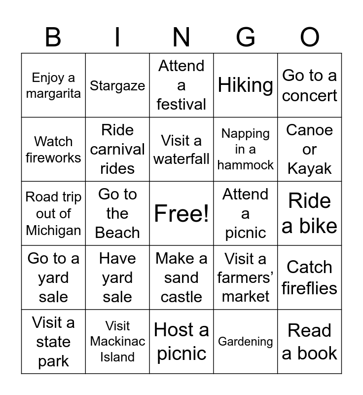 This bingo card has a free space and 30 words: Visit Mackinac Island, Visit the UP, Go to the Beach, Wear a Bikini or Speedo, Enjoy a margarita, Attend a festival, Ride carnival rides, Make a sand castle, Attend a picnic, Host a picnic, Ride a bike, Read a book, Gardening, Give or get a bouquet of fresh flowers, Canoe or Kayak, Eat Ice Cream, Visit a farmers’ market, Go to a yard sale, Have yard sale, Go to a concert, Road trip out of Michigan, Road trip in Michigan, Stargaze, Napping in a hammock, Watch fireworks, Hiking, Catch fireflies, Visit a state park, Visit a waterfall and Be creative.
