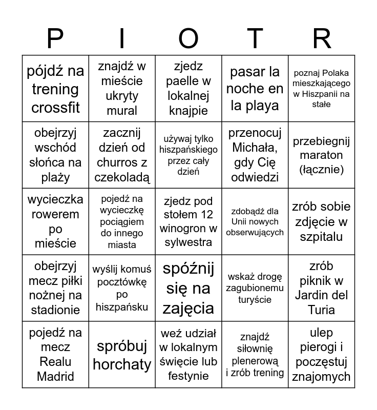 This bingo card has a free space and 24 words: wyślij komuś pocztówkę po hiszpańsku, spróbuj horchaty, używaj tylko hiszpańskiego przez cały dzień, pojedź na mecz Realu Madrid, poznaj Polaka mieszkającego w Hiszpanii na stałe, pójdź na trening crossfit, obejrzyj wschód słońca na plaży, znajdź w mieście ukryty mural, zdobądź dla Unii nowych obserwujących, spóźnij się na zajęcia, przenocuj Michała, gdy Cię odwiedzi, wycieczka rowerem po mieście, wskaż drogę zagubionemu turyście, zrób piknik w Jardin del Turia, zacznij dzień od churros z czekoladą, znajdź siłownię plenerową i zrób trening, zrób sobie zdjęcie w szpitalu, zjedz paelle w lokalnej knajpie, przebiegnij maraton (łącznie), pojedź na wycieczkę pociągiem do innego miasta, ulep pierogi i poczęstuj znajomych, obejrzyj mecz piłki nożnej na stadionie, pasar la noche en la playa and weź udział w lokalnym święcie lub festynie.