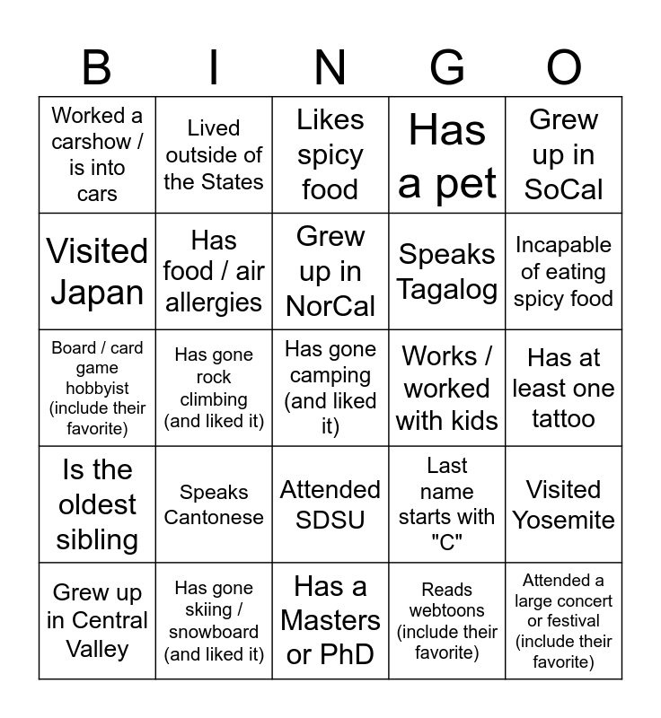 This bingo card has 25 words: Speaks Cantonese, Has a Masters or PhD, Grew up in NorCal, Grew up in Central Valley, Grew up in SoCal, Worked a carshow / is into cars, Visited Japan, Lived outside of the States, Works / worked with kids, Attended SDSU, Speaks Tagalog, Board / card game hobbyist (include their favorite), Last name starts with "C", Visited Yosemite, Has food / air allergies, Attended a large concert or festival (include their favorite), Has at least one tattoo, Likes spicy food, Incapable of eating spicy food, Has gone rock climbing (and liked it), Has gone camping (and liked it), Has gone skiing / snowboard (and liked it), Is the oldest sibling, Has a pet and Reads webtoons (include their favorite).