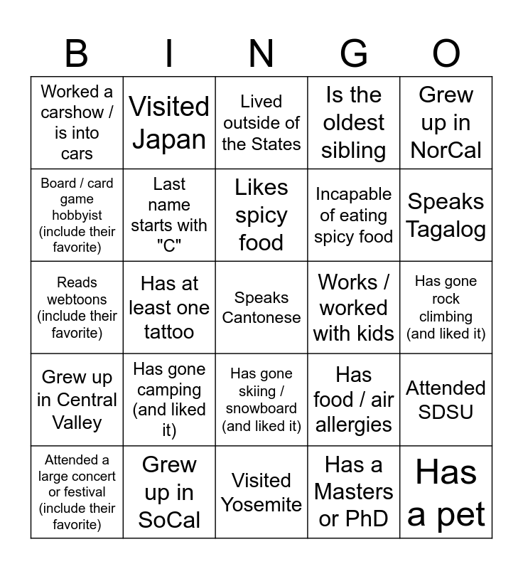 This bingo card has 25 words: Grew up in Central Valley, Grew up in SoCal, Speaks Cantonese, Has a Masters or PhD, Grew up in NorCal, Worked a carshow / is into cars, Visited Japan, Lived outside of the States, Works / worked with kids, Attended SDSU, Board / card game hobbyist (include their favorite), Last name starts with "C", Visited Yosemite, Has food / air allergies, Speaks Tagalog, Attended a large concert or festival (include their favorite), Has at least one tattoo, Likes spicy food, Incapable of eating spicy food, Has gone rock climbing (and liked it), Reads webtoons (include their favorite), Has gone camping (and liked it), Has gone skiing / snowboard (and liked it), Is the oldest sibling and Has a pet.