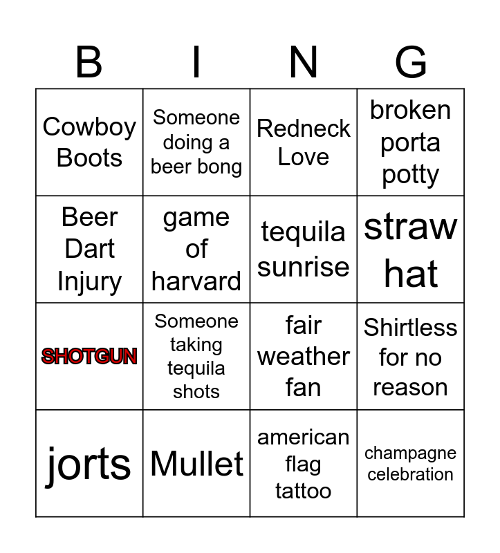 This bingo card has 20 words: Shirtless for no reason, Hector, Redneck Love, CJ Greaves' biggest fan, jorts, Beer Dart Injury, Mullet, Cowboy Boots, SHOTGUN, Someone doing a beer bong, Someone taking tequila shots, fair weather fan, game of harvard, champagne celebration, tequila sunrise, crandon pass outs, straw hat, broken porta potty, american flag tattoo and high heels.