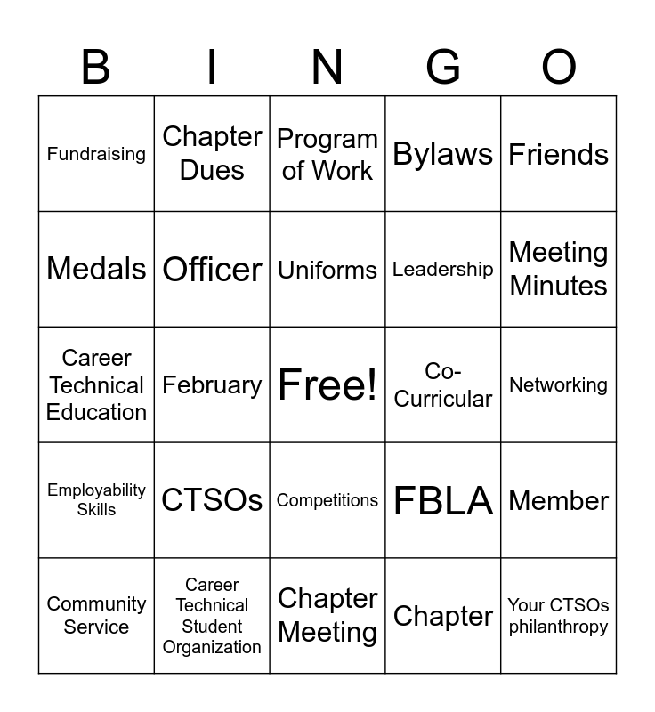 This bingo card has a free space and 24 words: CTSOs, Career Technical Student Organization, Uniforms, Community Service, Friends, Fundraising, Medals, Chapter Dues, Co-Curricular, Competitions, Leadership, Career Technical Education, FBLA, Member, Officer, Chapter, Networking, Program of Work, Meeting Minutes, February, Your CTSOs philanthropy, Employability Skills, Bylaws and Chapter Meeting.