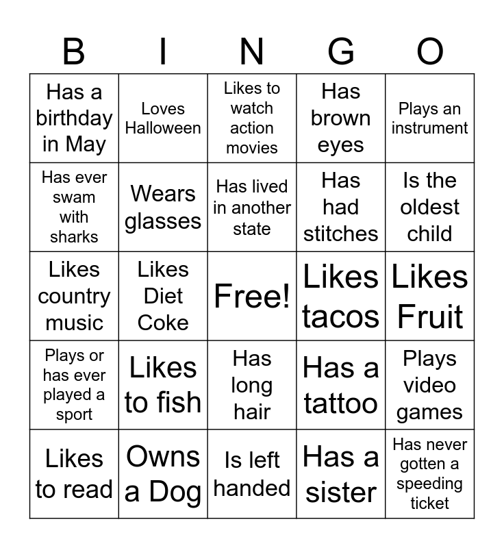 This bingo card has a free space and 24 words: Likes to fish, Owns a Dog, Has lived in another state, Likes to read, Plays an instrument, Has a birthday in May, Has ever swam with sharks, Loves Halloween, Likes tacos, Has long hair, Has had stitches, Likes country music, Has a tattoo, Plays video games, Wears glasses, Has a sister, Likes Fruit, Likes to watch action movies, Is the oldest child, Likes Diet Coke, Has never gotten a speeding ticket, Plays or has ever played a sport, Has brown eyes and Is left handed.