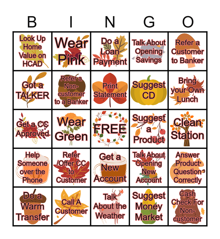 This bingo card has 24 images, a free space and 24 words: Refer /Offer CC to Customer, Call A Customer, Print Statement, Do a Warm Transfer, Refer a Customer to Banker, Look Up Home Value on HCAD, Got a TALKER, Wear Pink, Suggest a Product, Get a New Account, Suggest CD, Get a CC Approved, Talk About Opening New Account, Answer Product Question Correctly, Refer a Non-customer to a Banker, Suggest Money Market, Clean Station, Do a Loan Payment, Bring your Own Lunch, Wear Green, Cash Check For Non-customer, Help Someone over the Phone, Talk About Opening Savings and Talk About the Weather.