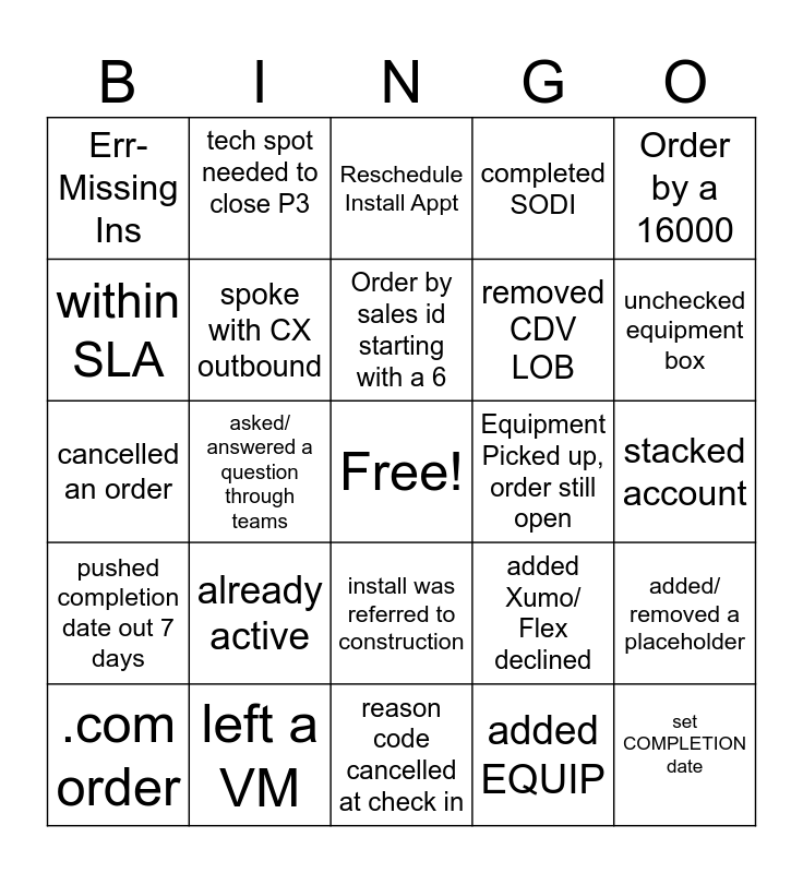 This bingo card has a free space and 59 words: spoke with CX inbound call, left a VM, created an order through OMS, pushed completion date out 7 days, added EQUIP, next Gen, spoke with CX outbound, order with no truck/ self move codes, removed CDV LOB, Mismatch modem, completed SODI, sent trend, within SLA, added CIP or FIP, drop bury, order, Err-Missing Ins, set COMPLETION date, Order by a 16000, order added a LOB, Order by sales id starting with a 6, Equipment Picked up, order still open, Reschedule Install Appt, .com order, added/ removed a placeholder, added NT reason code, added/updated billing stop/start date, order was missing shipping codes, location not serviceable, unchecked equipment box, worked an account that was previously worked, pushed completion date out 30 days, fraud/ invalid TN, REWIRE, owned equipment, tech spot needed to close P3, removed a pro install, moved equipment from a transfer, asked/ answered a question through teams, order removing a LOB, cancelled an order, checked for TPV, already active, stacked account, pushed out ONU2, CAO with no changes made, Err-Pro Instal Req, added GSK codes, mismatched video equipment, install was referred to construction, reason code cancelled at check in, reason code CX refused, refer to construction, duplicate account created for same customer, reason code no access, already cancelled, added Xumo/ Flex declined, already rescheduled, too early to call and cancelled collections or non pay.